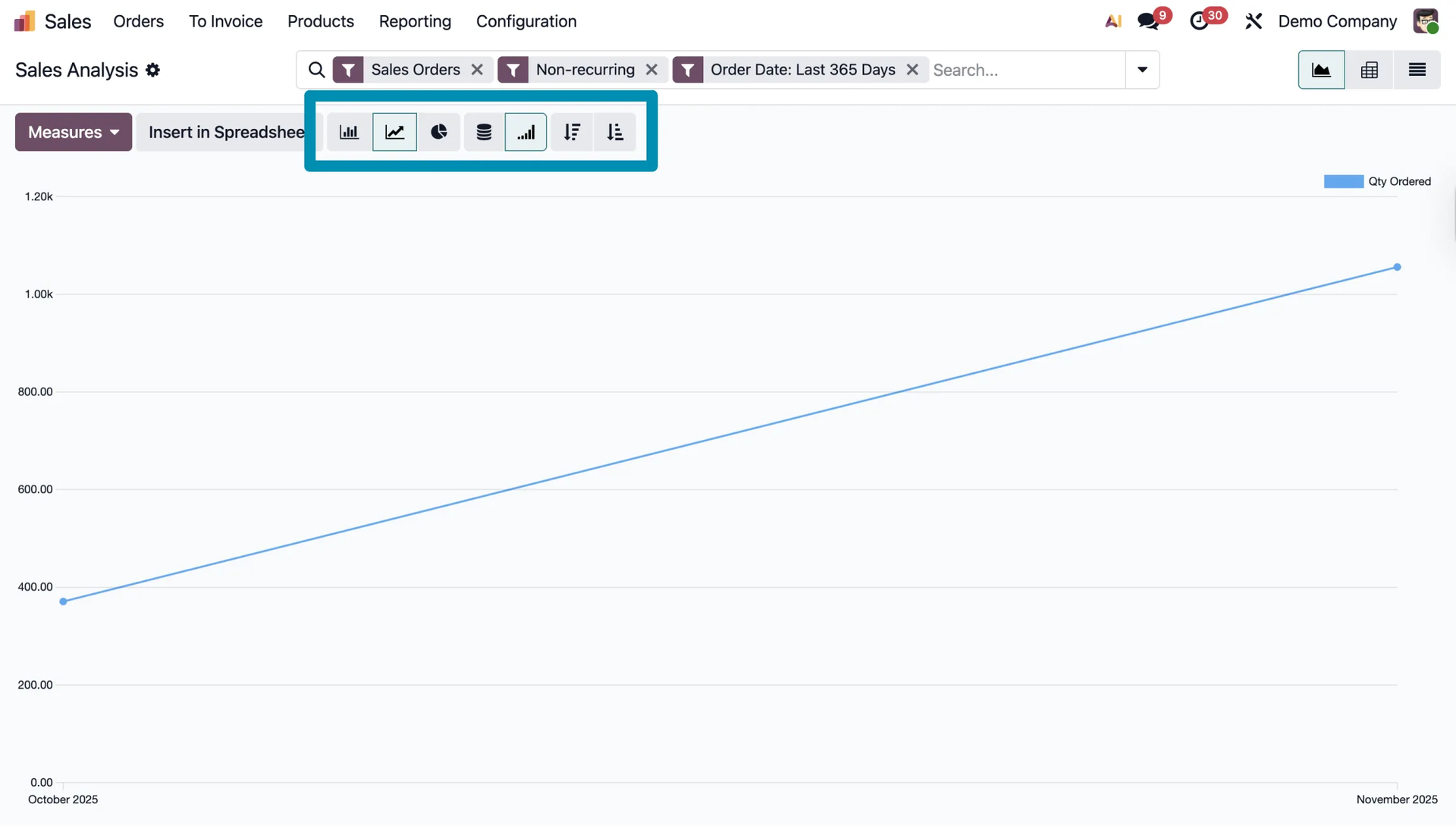 By default, you will see charts visualizing your sales. You can switch between different chart types, such as line, bar, or pie charts.