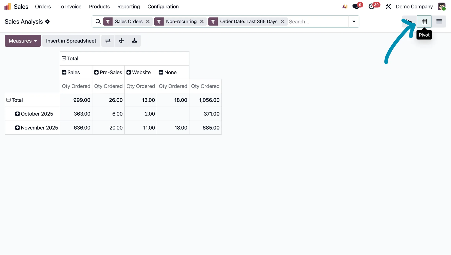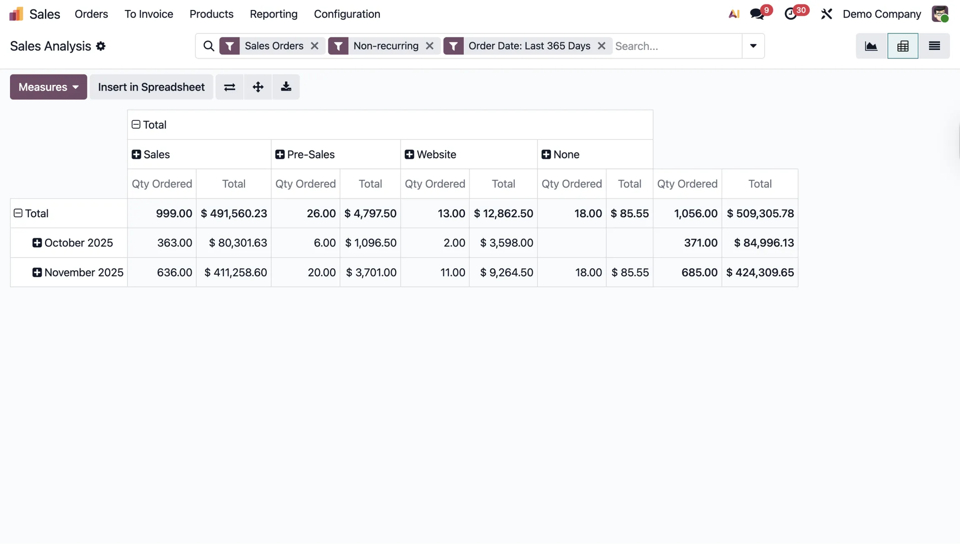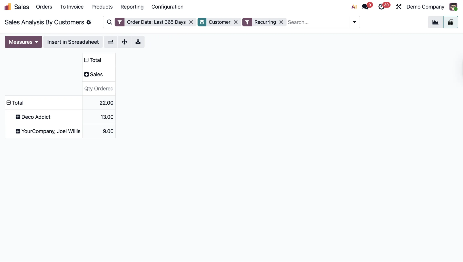 Using the pivot table and the Measures button, you can quickly check the total sales value generated by a given employee.