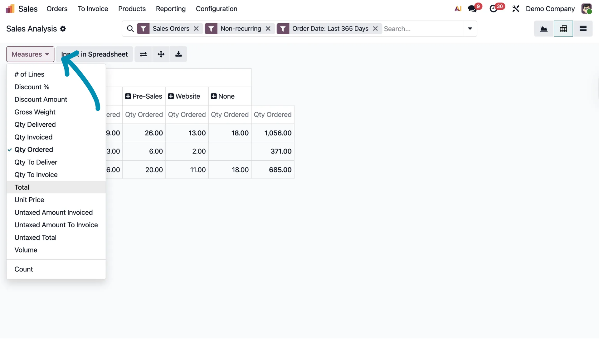 From this view, you can also do things like add metrics by clicking the Measures button and selecting the metrics you are interested in, such as Total.