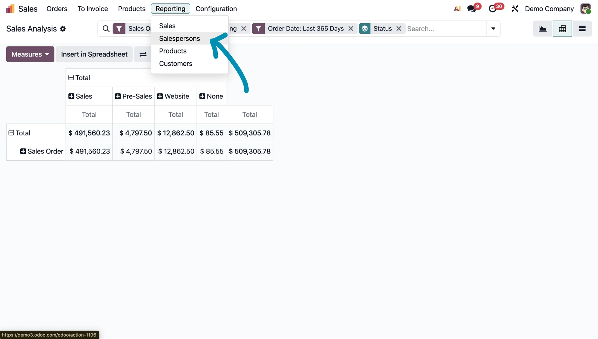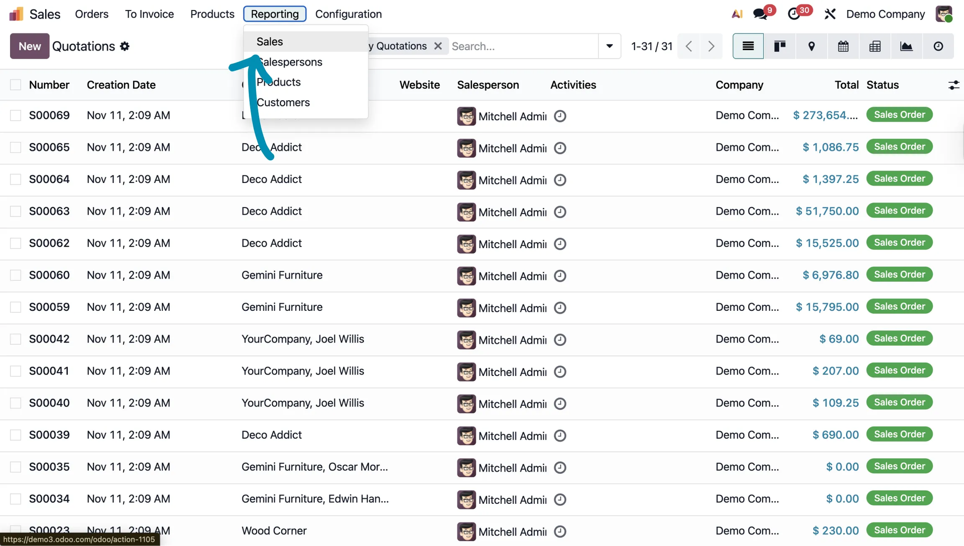 Let’s take a look at how this works in the Sales module. To access the basic indicators, go to the Sales module and select Reporting from the top menu.