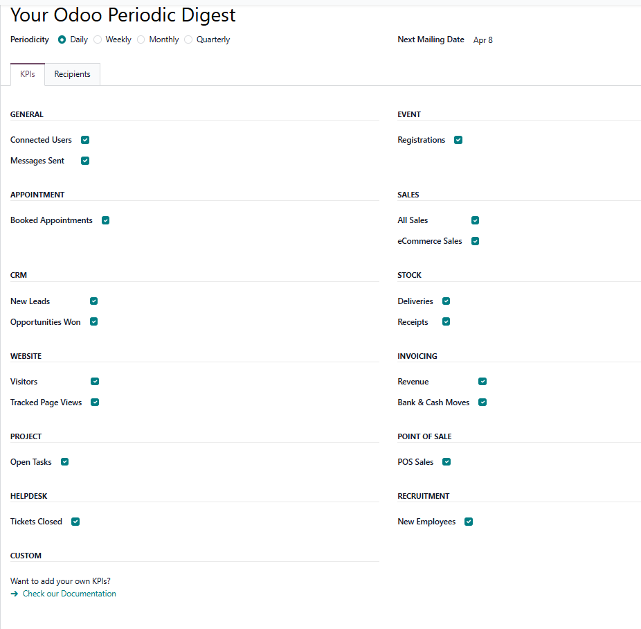 For people who do not log into the system every day, such as investors or executives, Odoo allows you to configure automatic notifications.