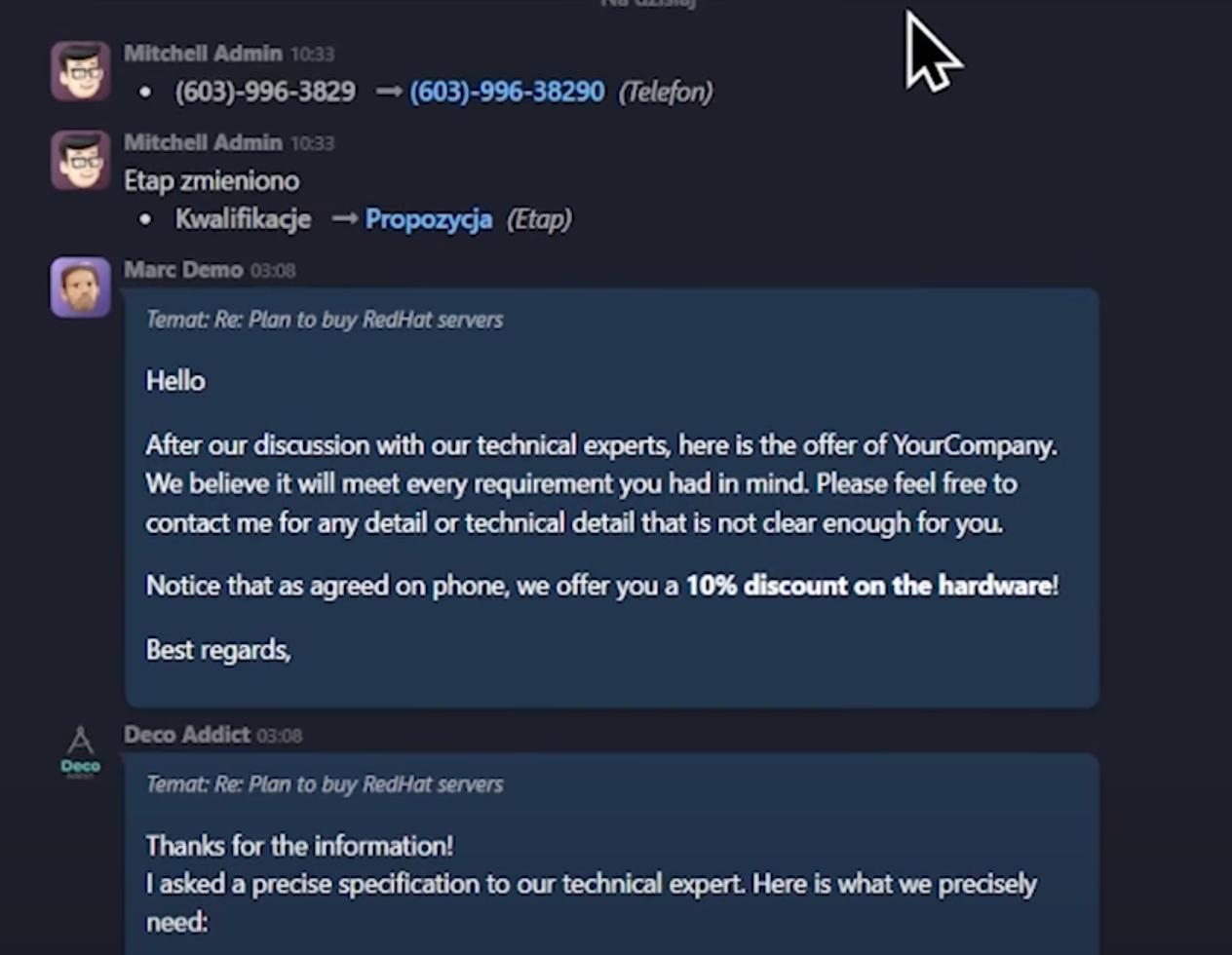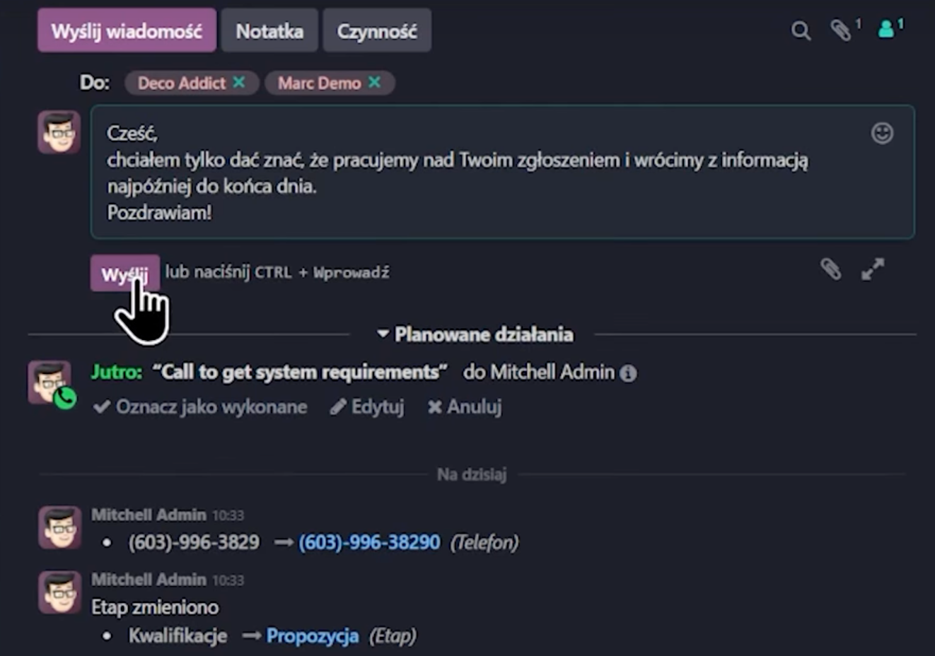 Chatter w Odoo staje się również centralnym punktem komunikacji z klientem i zespołem.