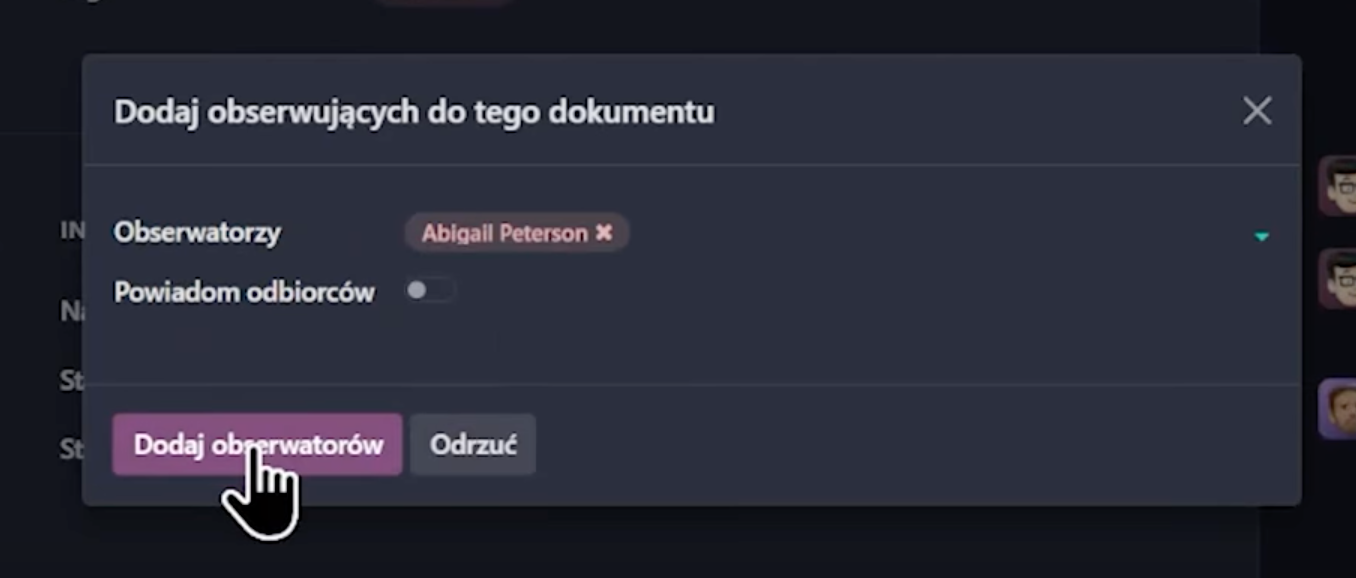 - Dodajesz swojego kolegę lub koleżankę z zespołu albo osobę kontaktową po stronie klienta – wtedy wszystkie wysyłane maile będą również trafiać do nich.