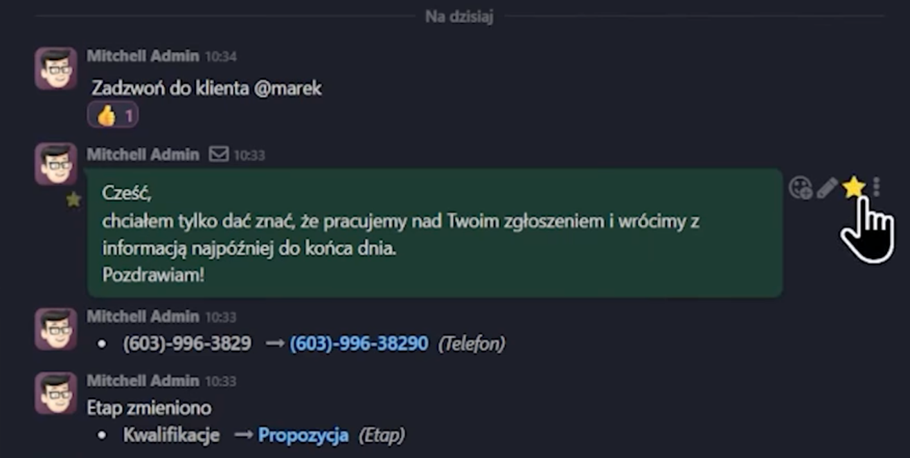 Przy każdej wiadomości w Chatter w Odoo możesz najechać kursorem i dodać emotikonkę (np. potwierdzając przeczytanie znakiem "OK" lub zadając pytanie znakiem zapytania). Możesz też oznaczyć ważny wpis gwiazdką. Taki wpis trafia wtedy do zakładki "Oznaczone gwiazdką" w aplikacji Dyskusje, ułatwiając szybkie odnalezienie kluczowych informacji w przyszłości.