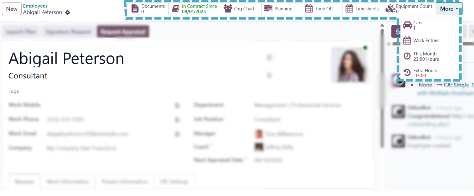 Na górze strony profilu pracownika znajdują się tzw. smart buttons, które dają szybki wgląd w to, co się dzieje z pracownikiem. Przykładami takich smart buttons mogą być: