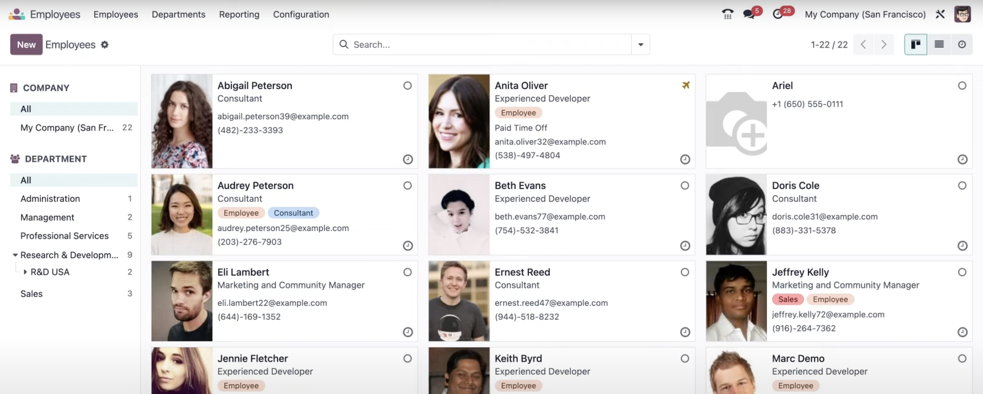 Na głównym pulpicie tej aplikacji zobaczysz wszystkich swoich pracowników, z możliwością wyszukiwania oraz filtrowania (np. według Działu). Klikając w dany dział, Odoo wyświetli tylko pracowników do niego należących.
