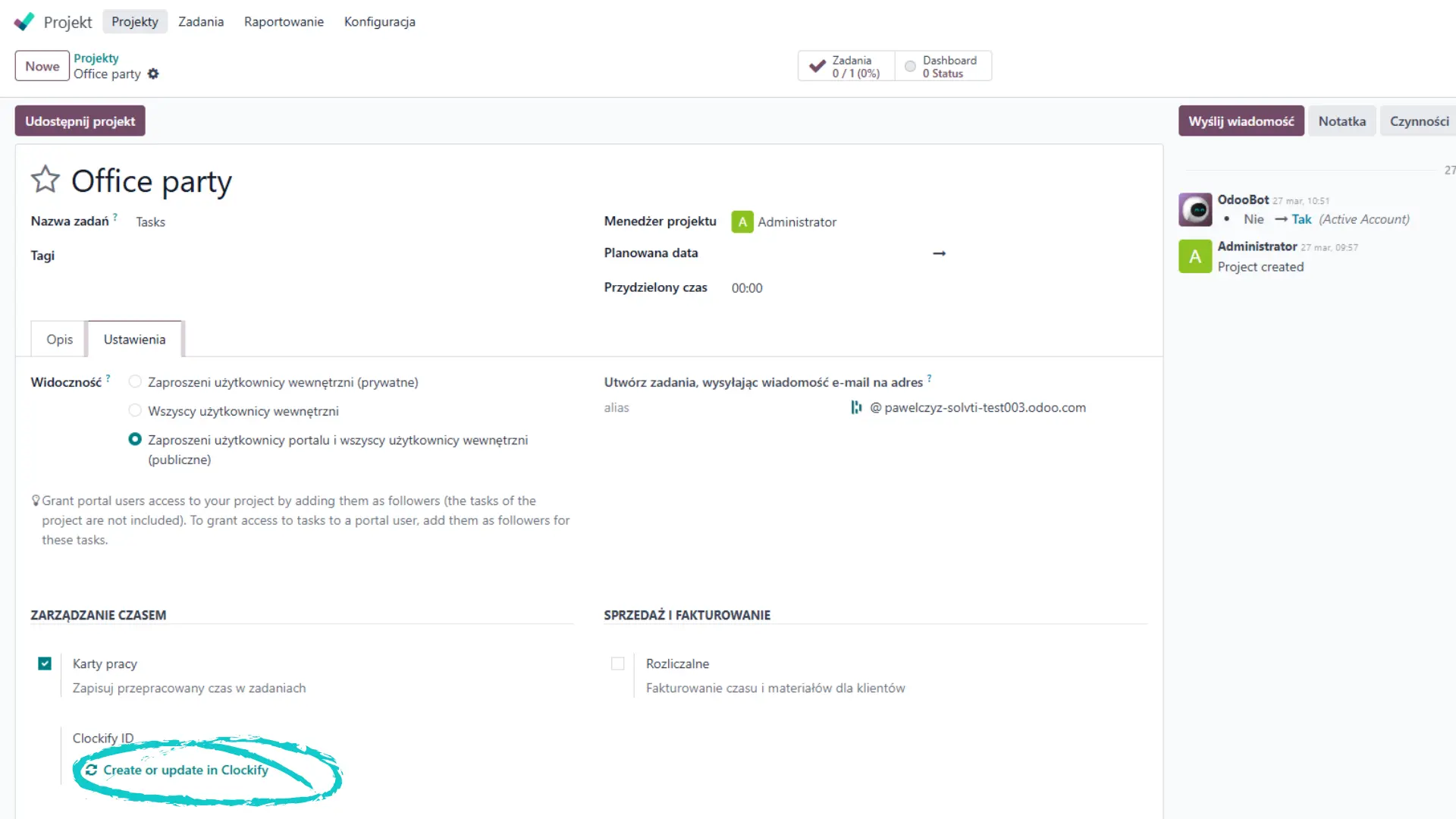 Utwórz projekt w Odoo i wyślij go do Clockify jednym kliknięciem.